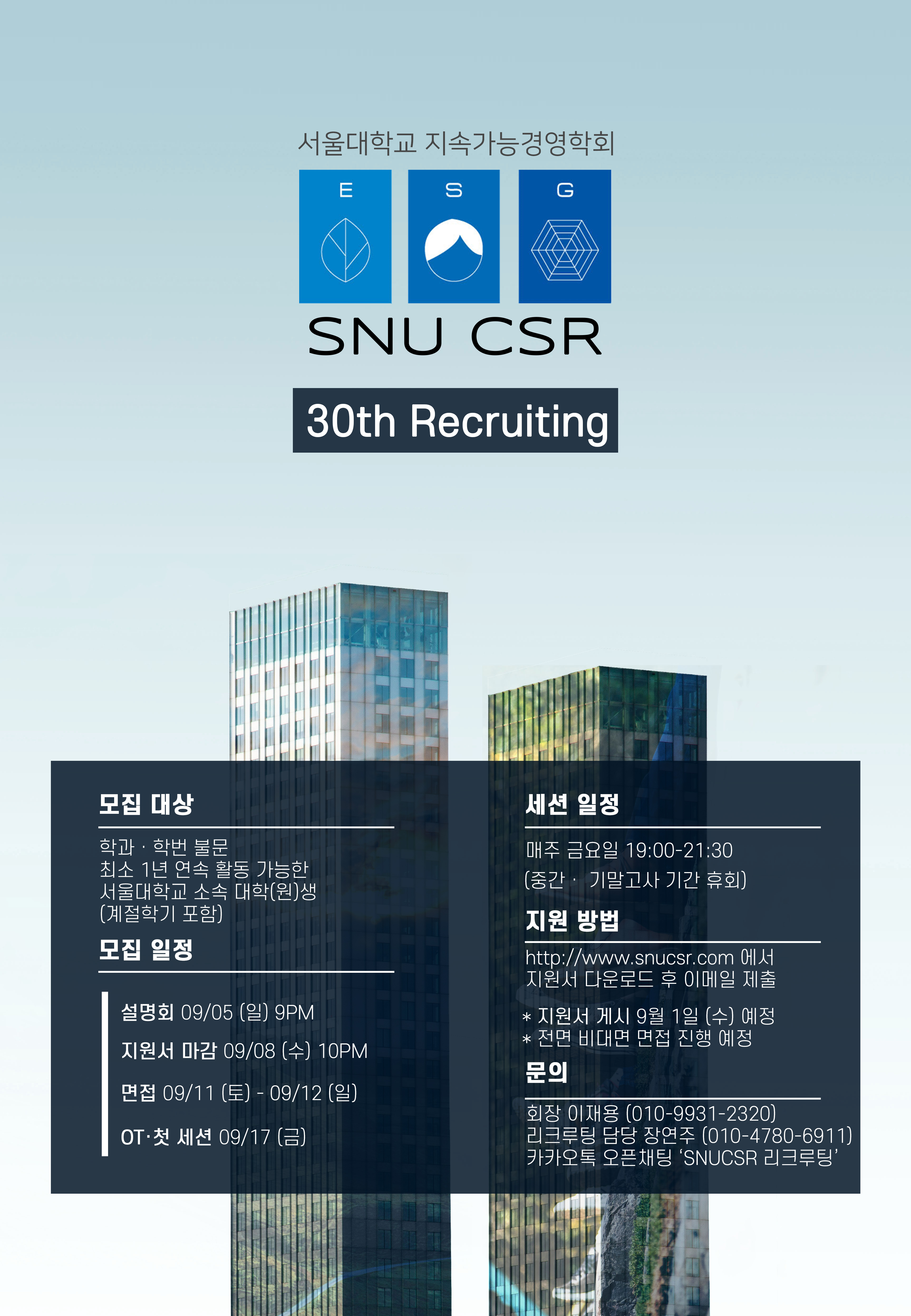 *지원방법 : 지원서 양식을 내려받아 작성하신 후 snucsr@gmail.com으로 9월 8일 수요일 22시까지 제출해주시길 바랍니다. 파일명은 ‘SNUCSR_30기_이름_학번’으로 설정 바랍니다.
