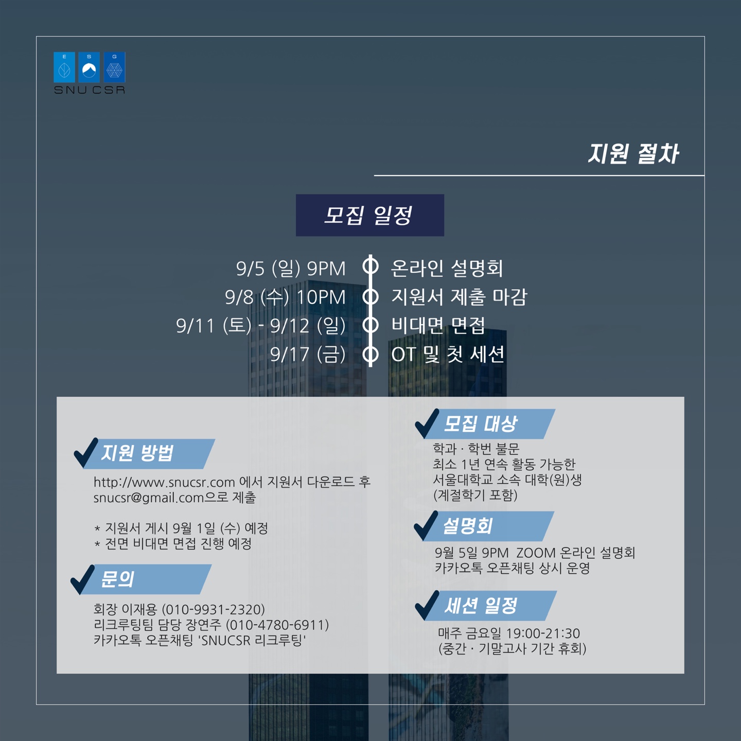 카카오톡 오픈채팅 상시 운영: 'SNUCSR 리크루팅' (https://open.kakao.com/o/g8GXPiwd)