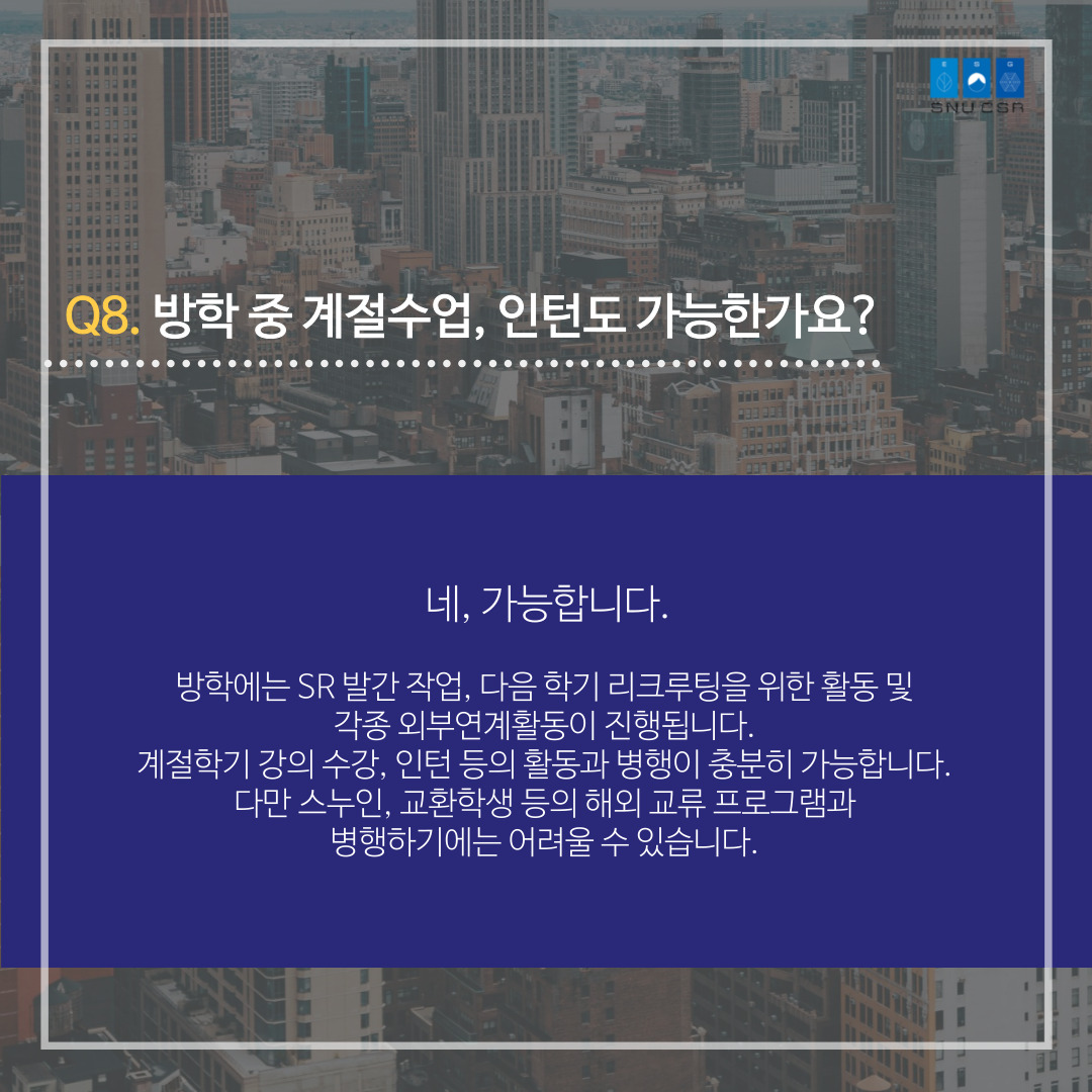 SNUCSR의 활동, 지원자격, 면접 등이 궁금하셨다면 카드뉴스를 통해 확인해주세요.
