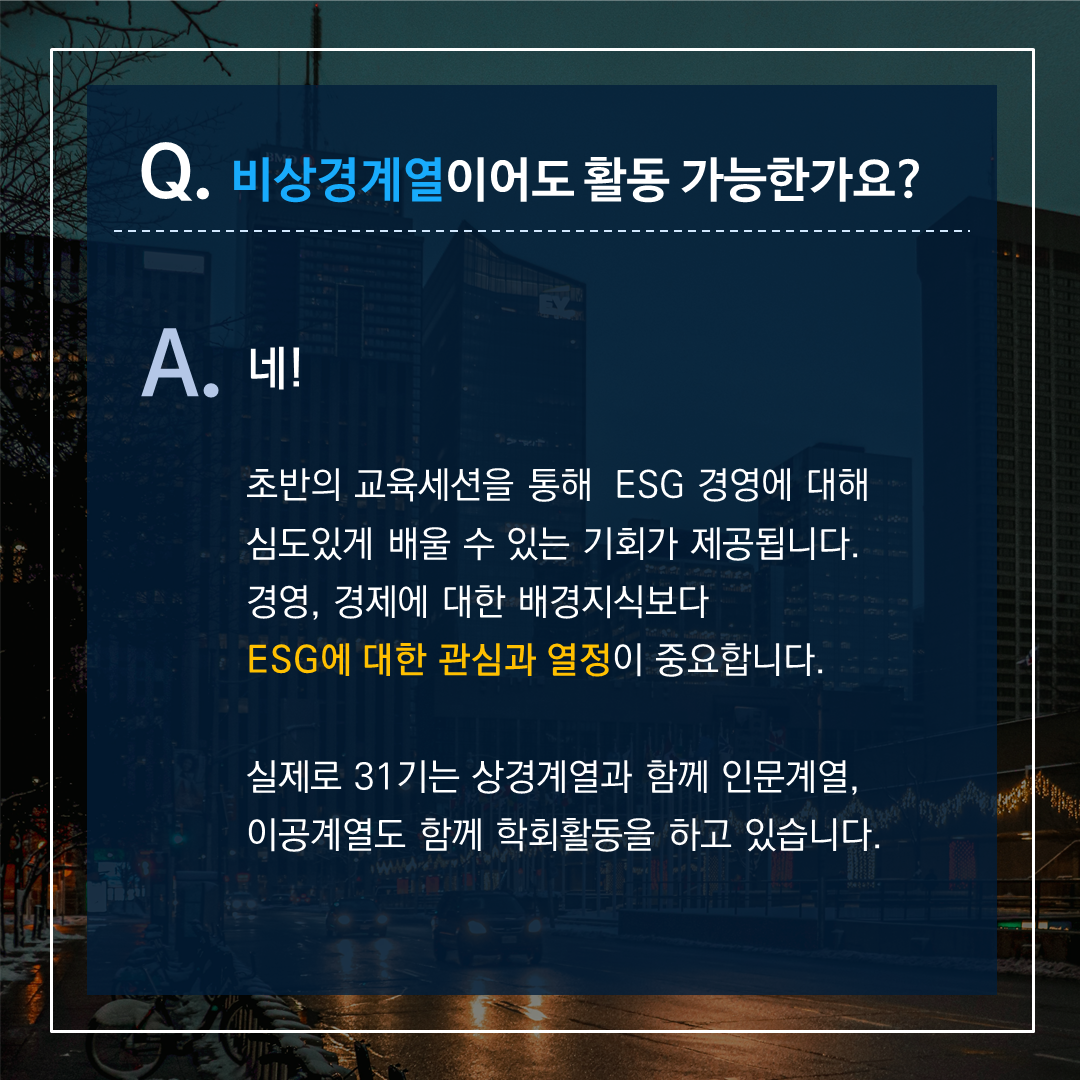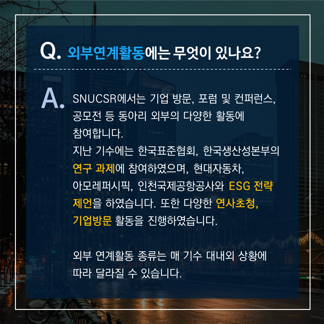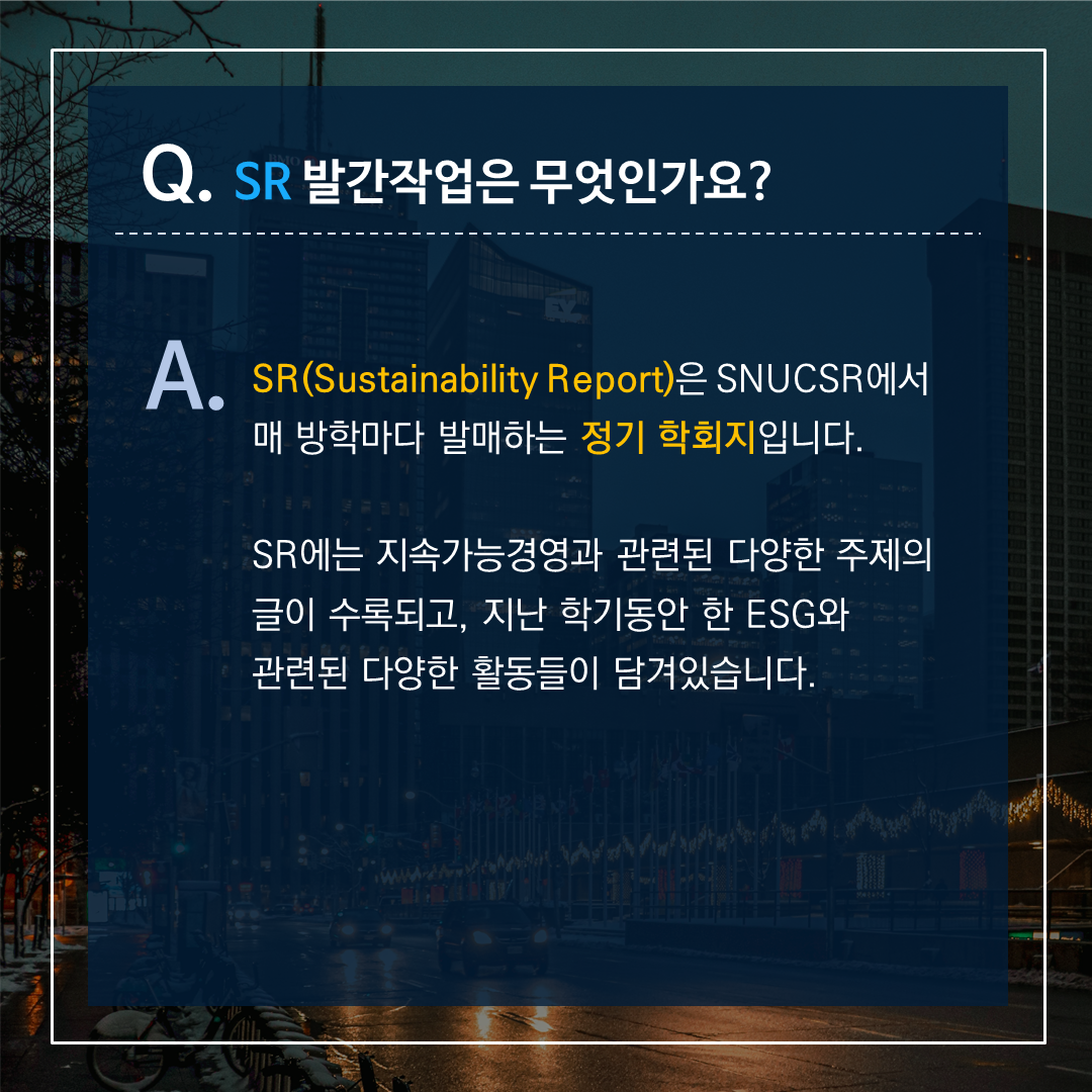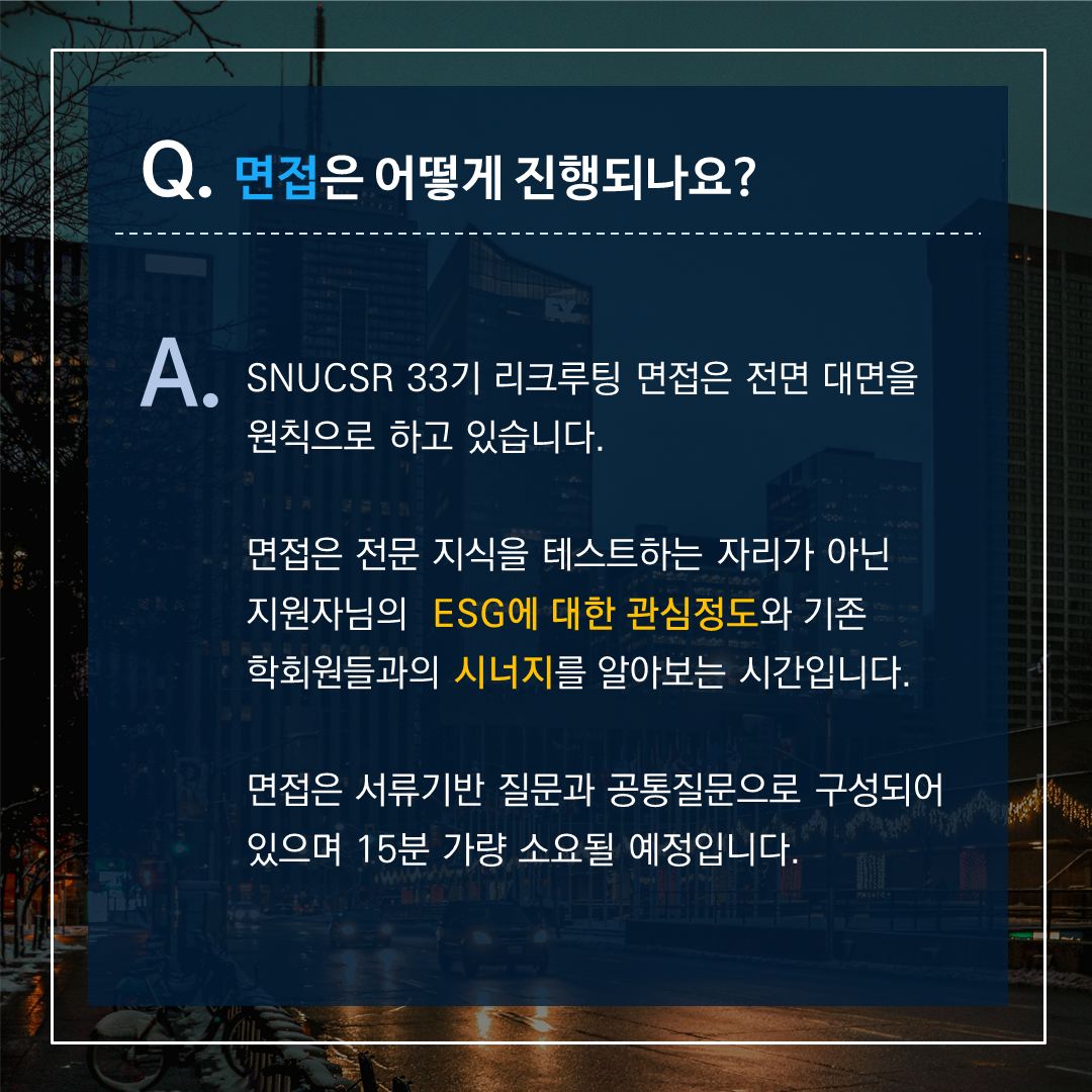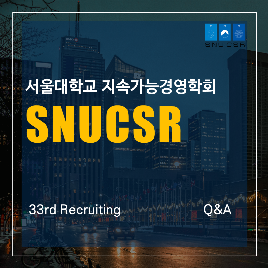 서울대학교 유일의 ✨CSR & ESG 경영 학회✨ SNUCSR의 33기 리크루팅이 2월 27일부터 시작됩니다! 이번 게시물에서는 학회 활동, 지원 자격, 면접 등에 대한 여러 질문들에 답변해 드립니다!
