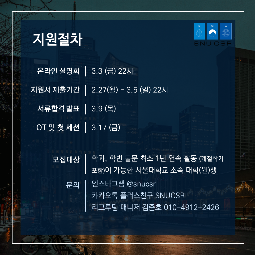 ✅ 지원서 오픈 : 2월 27일 (월) SNUCSR 홈페이지 (www.snucsr.com)