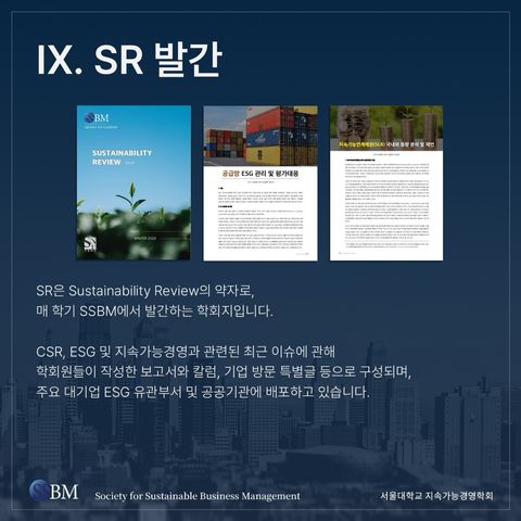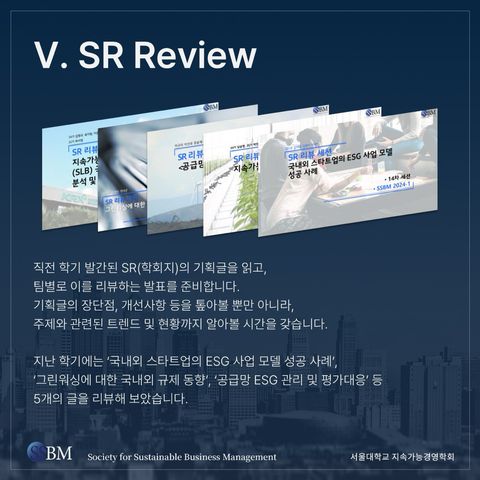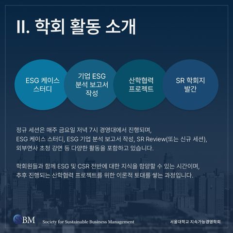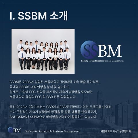 🟢 SSBM은 2006년 창립된 서울대학교 경영대학 소속 학술동아리로, 교내 유일의 ESG 및 CSR 전문 학회입니다. 특히 2023년 2학기부터는 CSR에서 ESG로 전환되고 있는 트렌드를 반영하여 ‘SNUCSR’에서 ‘SSBM’으로 학회명을 변경하여 활동하고 있습니다.