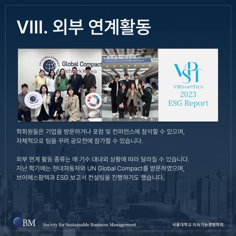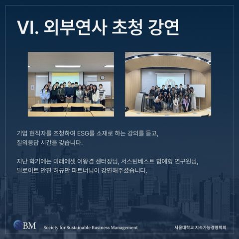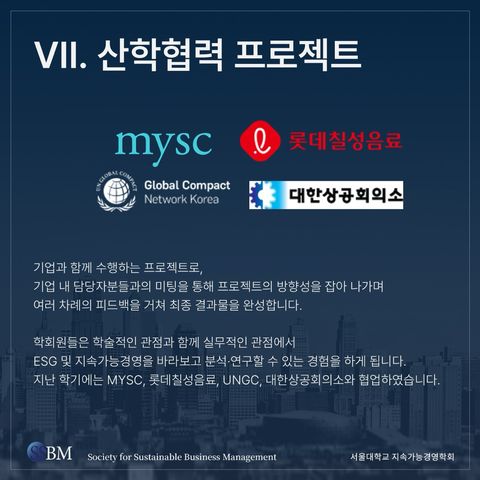 🔵 2024년 봄학기에는 MYSC, 롯데칠성음료, UNGC, 대한상공회의소와 산학협력 프로젝트를 진행하였으며, 현대자동차와 UN Global Compact 한국네트워크를 방문하였습니다. 또한 정규세션으로는 케이스스터디, ESG 분석 보고서 작성, SR Review 등 다양한 활동을 진행하여 ESG 및 지속가능경영 전반에 대하여 심도 있게 탐구하였습니다. SSBM에서는 정규세션을 통해 기른 지식을 바탕으로 다양한 외부 협력 활동에서 학회원들이 독창적인 아이디어를 제안 및 공유하고, 실무적 역량을 기를 수 있는 기회를 제공하고 있습니다.