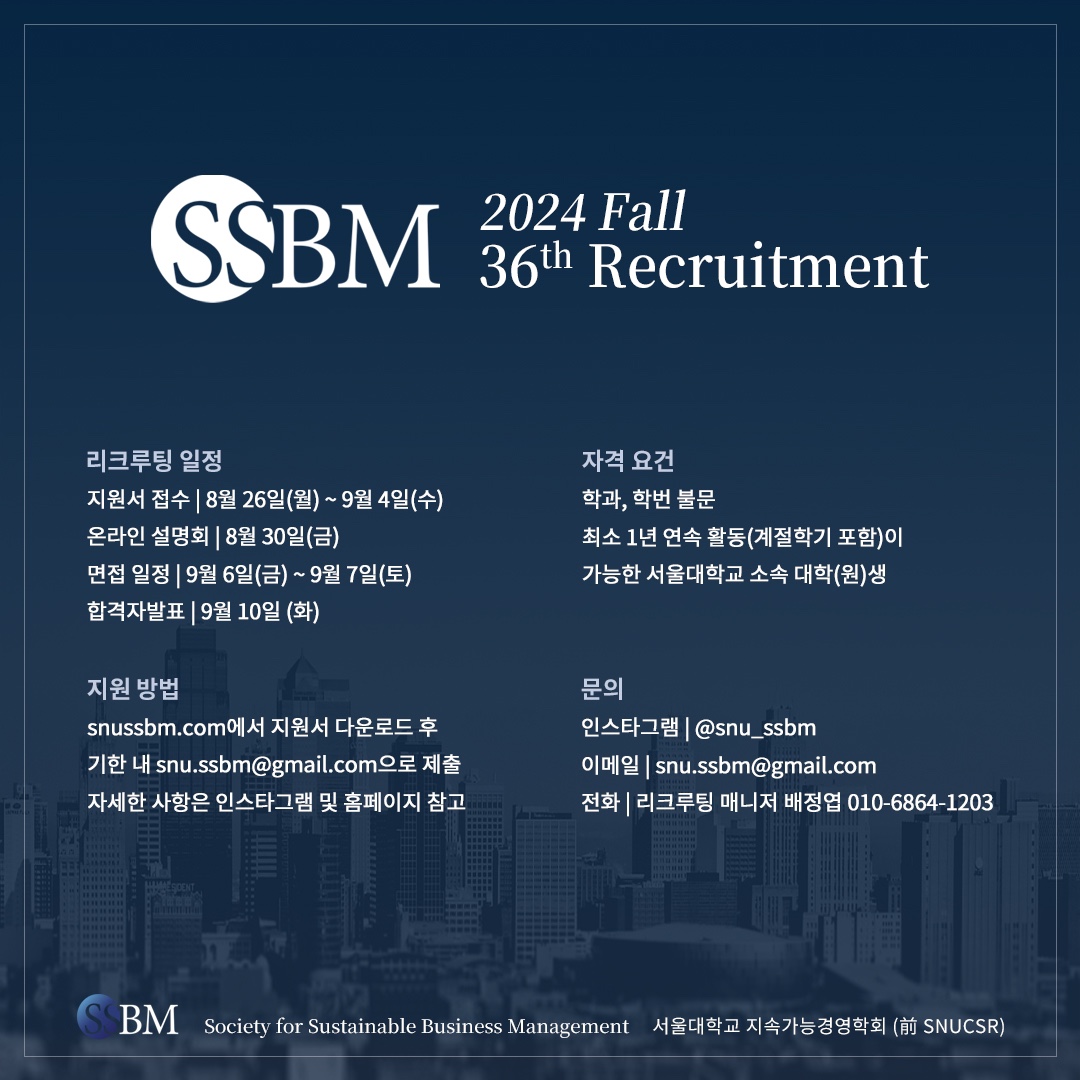 서울대학교 유일 💫ESG&지속가능경영학회 SSBM💫에서 36기 신입 학회원을 모집합니다!