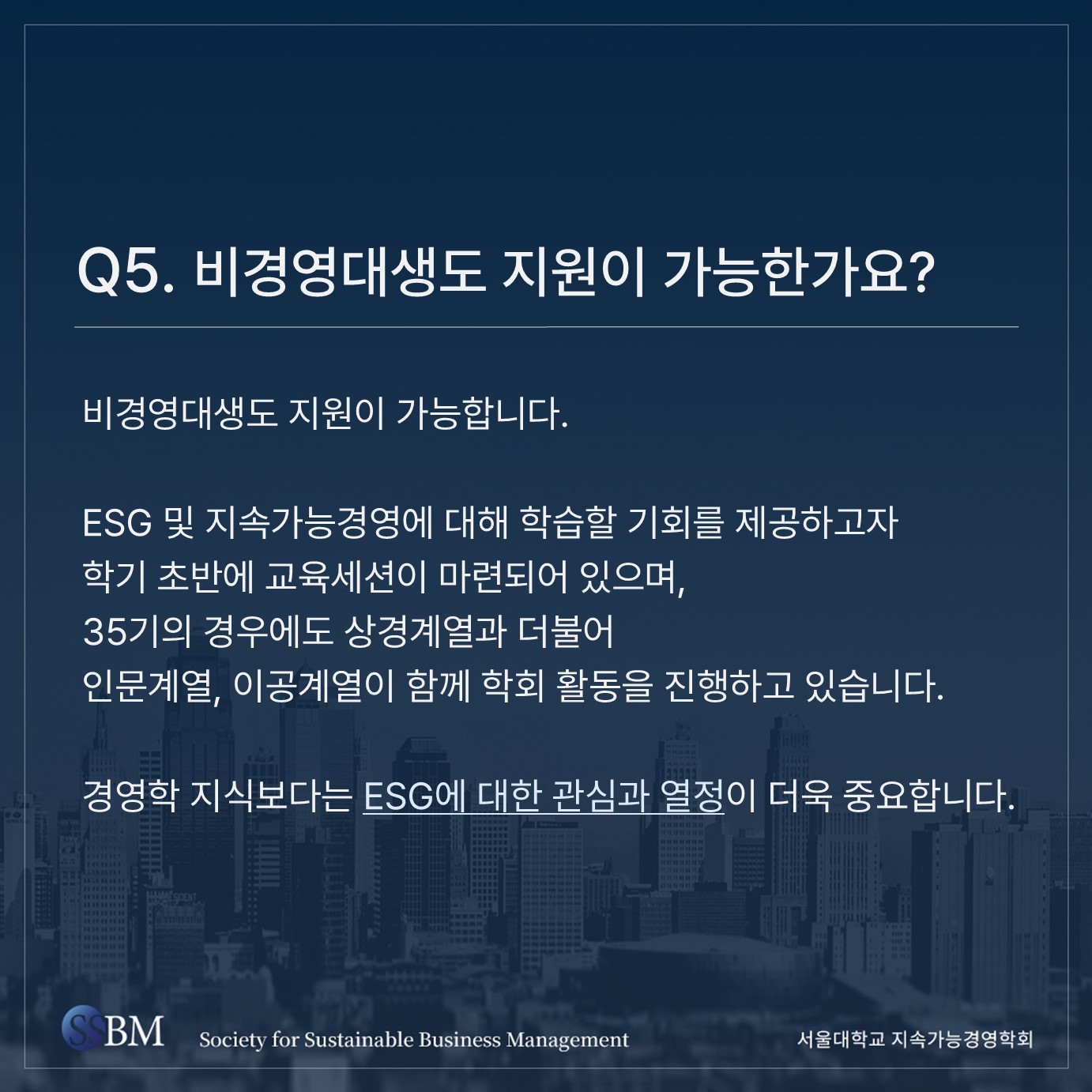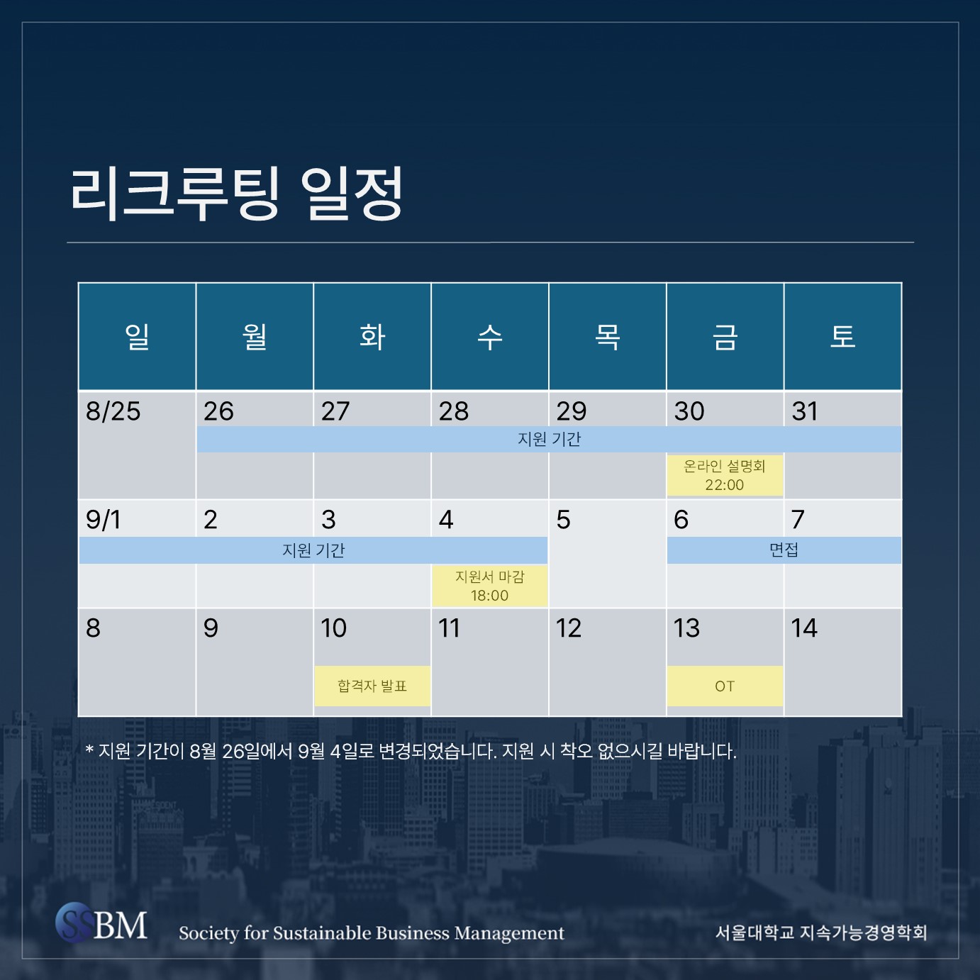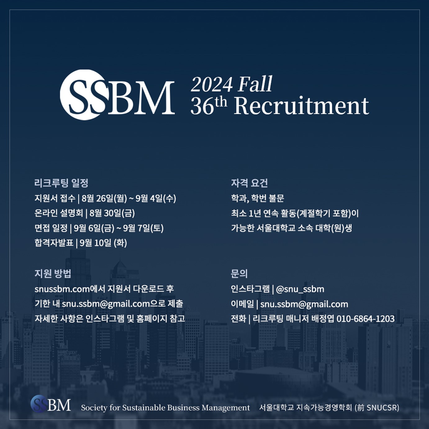 서울대학교 유일 💫ESG&지속가능경영학회 SSBM💫의 36기 리크루팅이 8월 26일부터 시작됩니다!