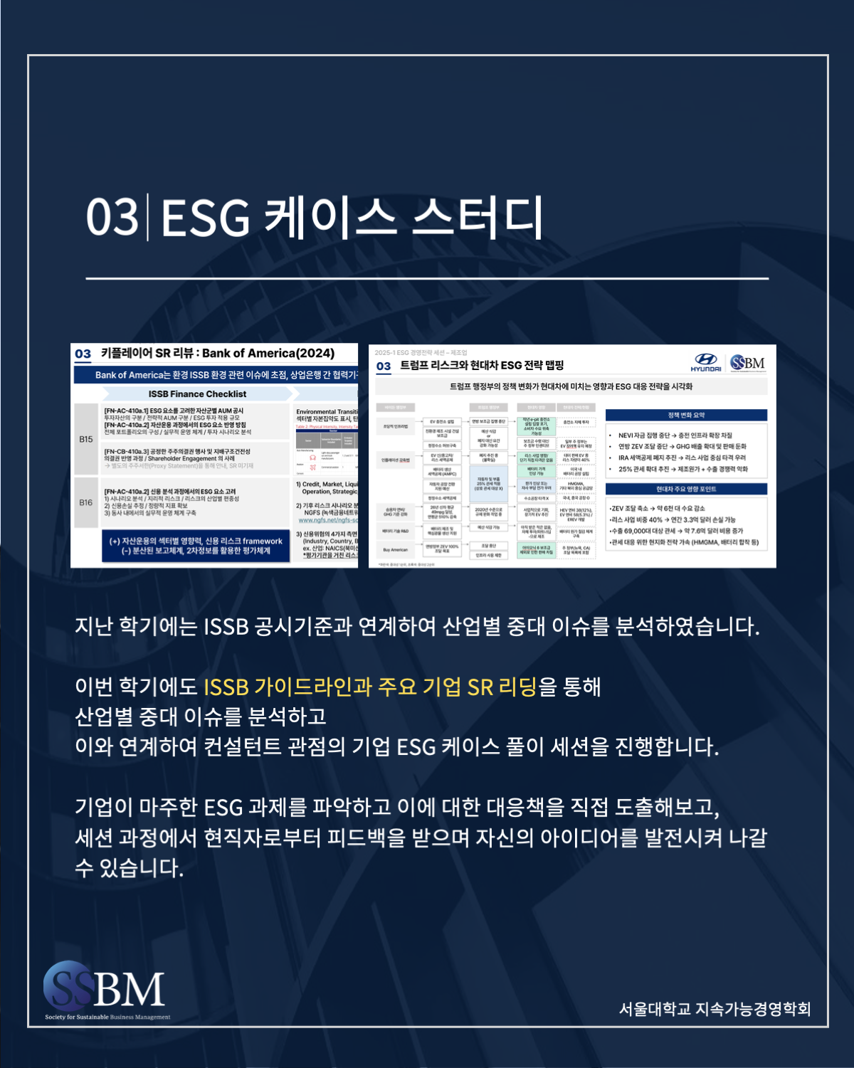 또한 정규세션으로는 ISSB중대이슈스터디, ESG 경영전략 및 투자 세션, ESG 기업 분석 보고서 작성, SR Review 등 다양한 활동을 진행하여 ESG 및 지속가능경영 전반에 대하여 심도 있게 탐구하였습니다.