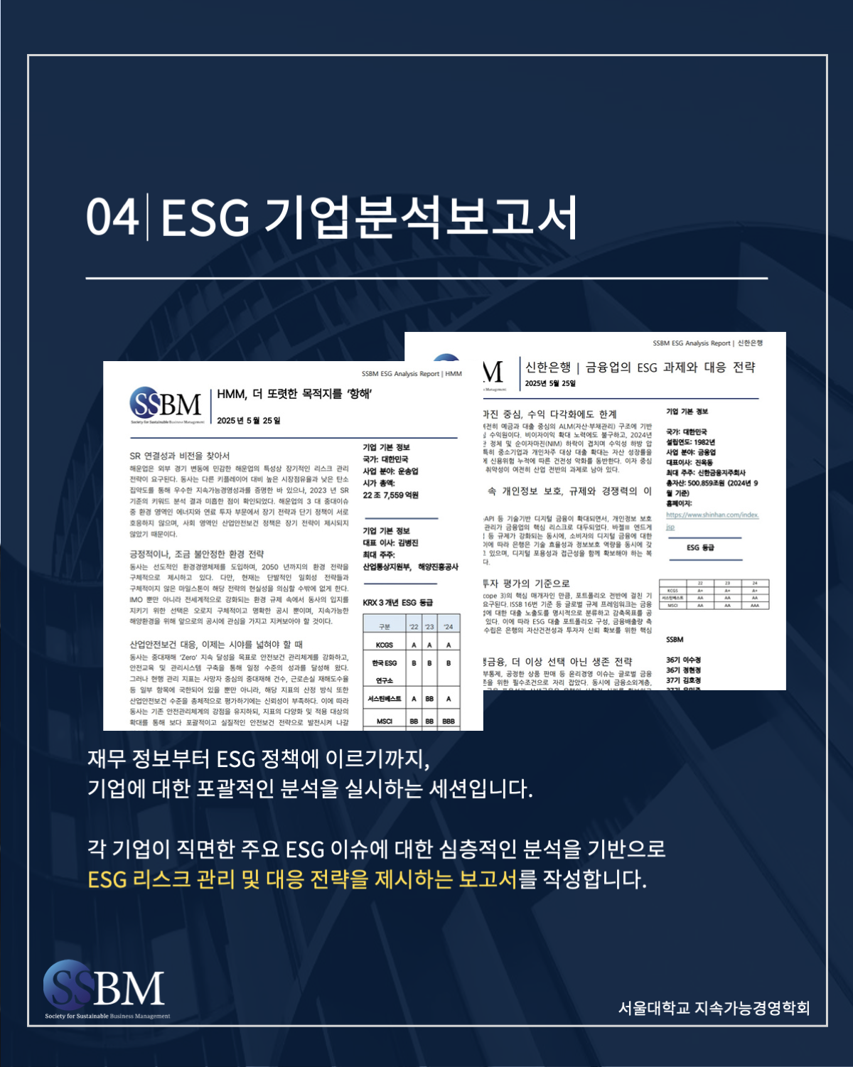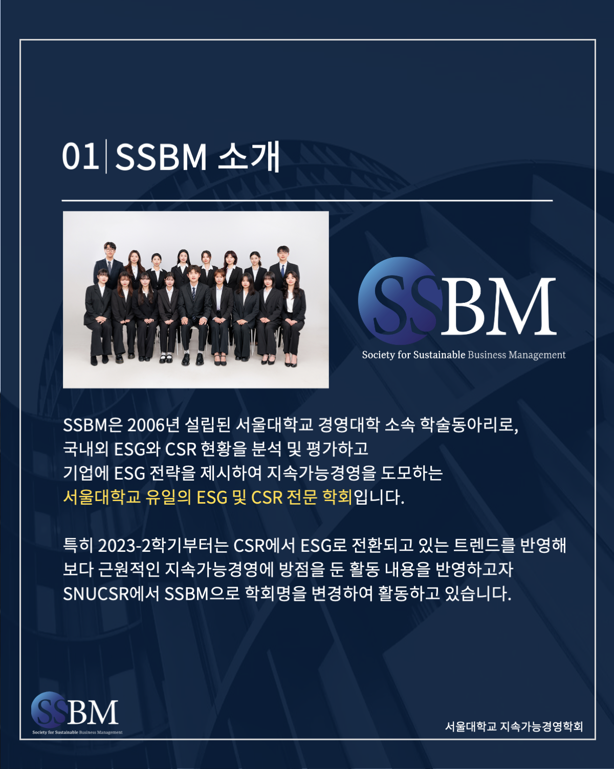🟢 SSBM은 2006년 창립된 서울대학교 경영대학 소속 학술동아리로, 교내 유일의 ESG 및 CSR 전문 학회입니다. 특히 2023년 2학기부터는 CSR에서 ESG로 전환되고 있는 트렌드를 반영하여 ‘SNUCSR’에서 ‘SSBM’으로 학회명을 변경하여 활동하고 있습니다.