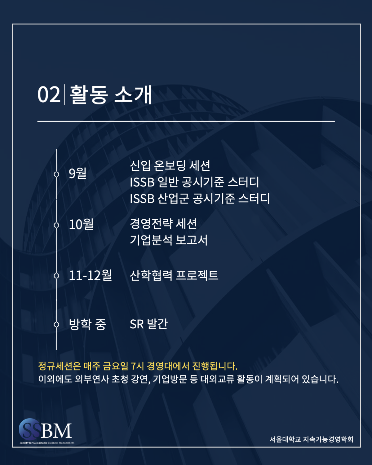 🟢 SSBM은 2006년 창립된 서울대학교 경영대학 소속 학술동아리로, 교내 유일의 ESG 및 CSR 전문 학회입니다. 특히 2023년 2학기부터는 CSR에서 ESG로 전환되고 있는 트렌드를 반영하여 ‘SNUCSR’에서 ‘SSBM’으로 학회명을 변경하여 활동하고 있습니다.
