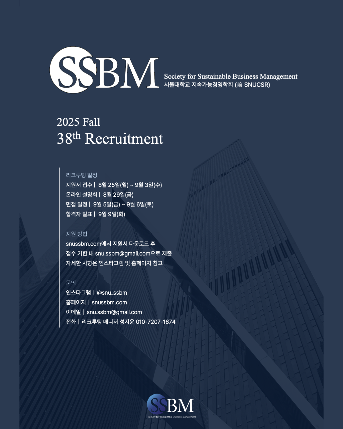 서울대학교 유일 💫ESG&지속가능경영학회 SSBM💫의 38기 리크루팅이 8월 25일부로 시작되었습니다!