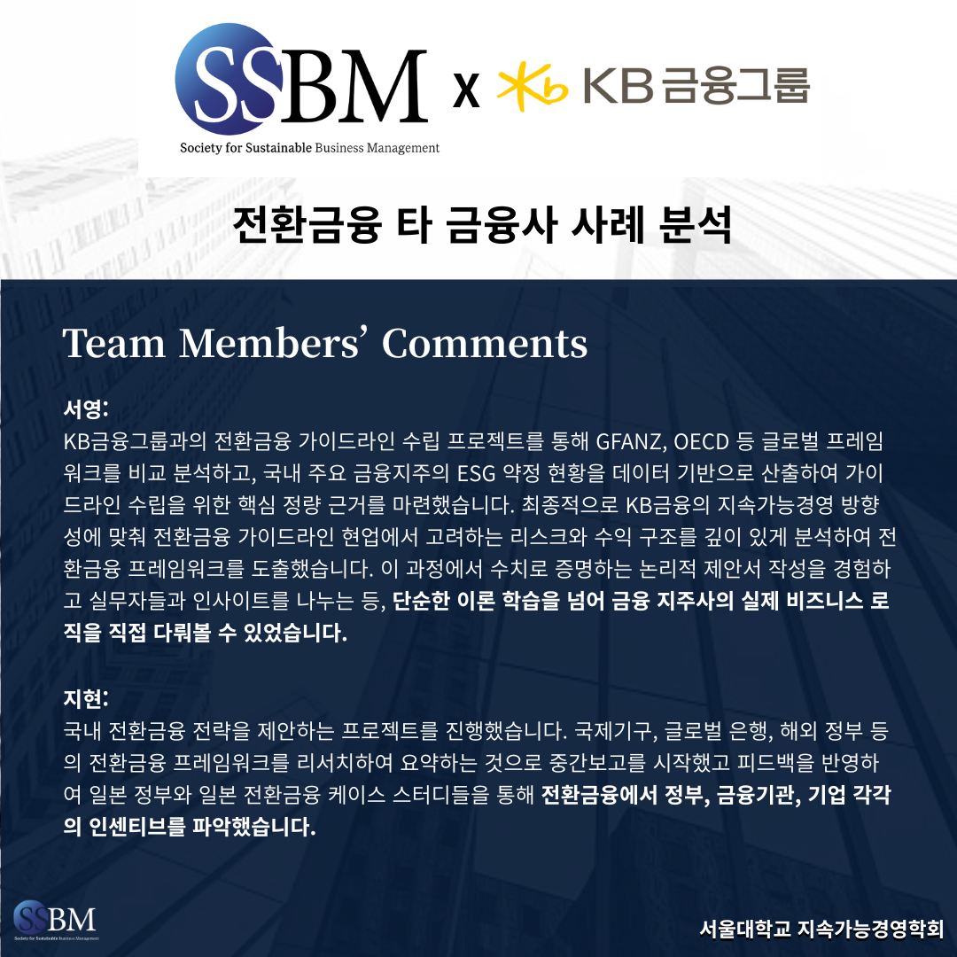 🔷 2025년 가을학기에는 삼정KPMG, IBK 기업은행, KB금융지주, CJ제일제당, 소풍벤처스와 산학협력 프로젝트를 진행하였으며, HD현대오일뱅크, 한영EY 등에서 외부연사를 초청하여 연사특강을 진행했습니다. 또한 정규세션으로는 ISSB 중대이슈 스터디, ESG 경영전략 세션, ESG 기업분석보고서 작성, SR 작성 등 다양한 활동을 진행하여 ESG 및 지속가능경영 전반에 대하여 심도 있게 탐구하였습니다.