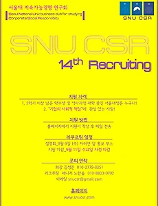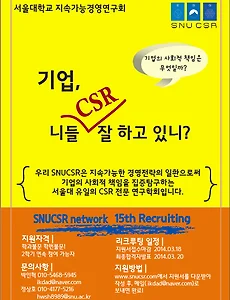 SSBM169 15기 지원서 양식 2014. 2. 19. 2014년 1학기 15기 모집 지원을 희망하시는 분은 위의 지원서 양식을 다운받아 작성 후, ikdad@naver.com으로 보내주시기 바랍니다. 2014. 2. 19. Sustainability Review vol.20 Sustainability Review vol.20 2013. 9. 2. 2013년 2학기 14기 모집 OT는 9월 16일 월요일 6시 반 예정이며, MT는 10월 2일 예정입니다. 지원을 희망하시는 분은 2013년 9월 11일 자정까지 위의 양식을 작성하여 snucsr@gmail.com으로 보내주시기 바랍니다. 2013. 8. 20. 13기 운영진 인사드립니다. 김성진 안녕하세요! SNUCSR 13기 회장을 맡게 된 김성진입니다. CSR이 지속적으로 이루어질 수 있을지에 대한 궁금증을 풀기 위해 SNUCSR의 문을 두드린 것이 엊그제 같은데 벌써 한 학기가 지나고 후배기수를 받는다니 감회가 새롭습니다. 짧다면 짧고 길다고 하면 길 수 있는 지난 한 학기의 시간 동안 정말 많은 것을 배울 수 있었습니다. 선배 기수들을 따라다니며 CSR을 담당하는 기업 실무자도 만나보고, 포럼에 참여하며 새로운 내용을 경험하였습니다. 또한 잡지를 쓰며, 혹은 공모전을 준비하며 CSR의 방향과 미래에 대해서도 고민하게 되었습니다. 많은 것을 느끼고 배웠지만 아직도 모르는 것이 너무 많습니다. 다만, CSR이라는 분야가 앞으로 더욱 중요한 영역이 될 것이라는 확신과 이 분야를 더 알고.. 2013. 8. 12. 13기 지원서 양식 13기 지원자 여러분은 본 양식으로 지원해주시기 바랍니다. 2013. 3. 7. 이전 1 ··· 20 21 22 23 24 25 26 ··· 29 다음