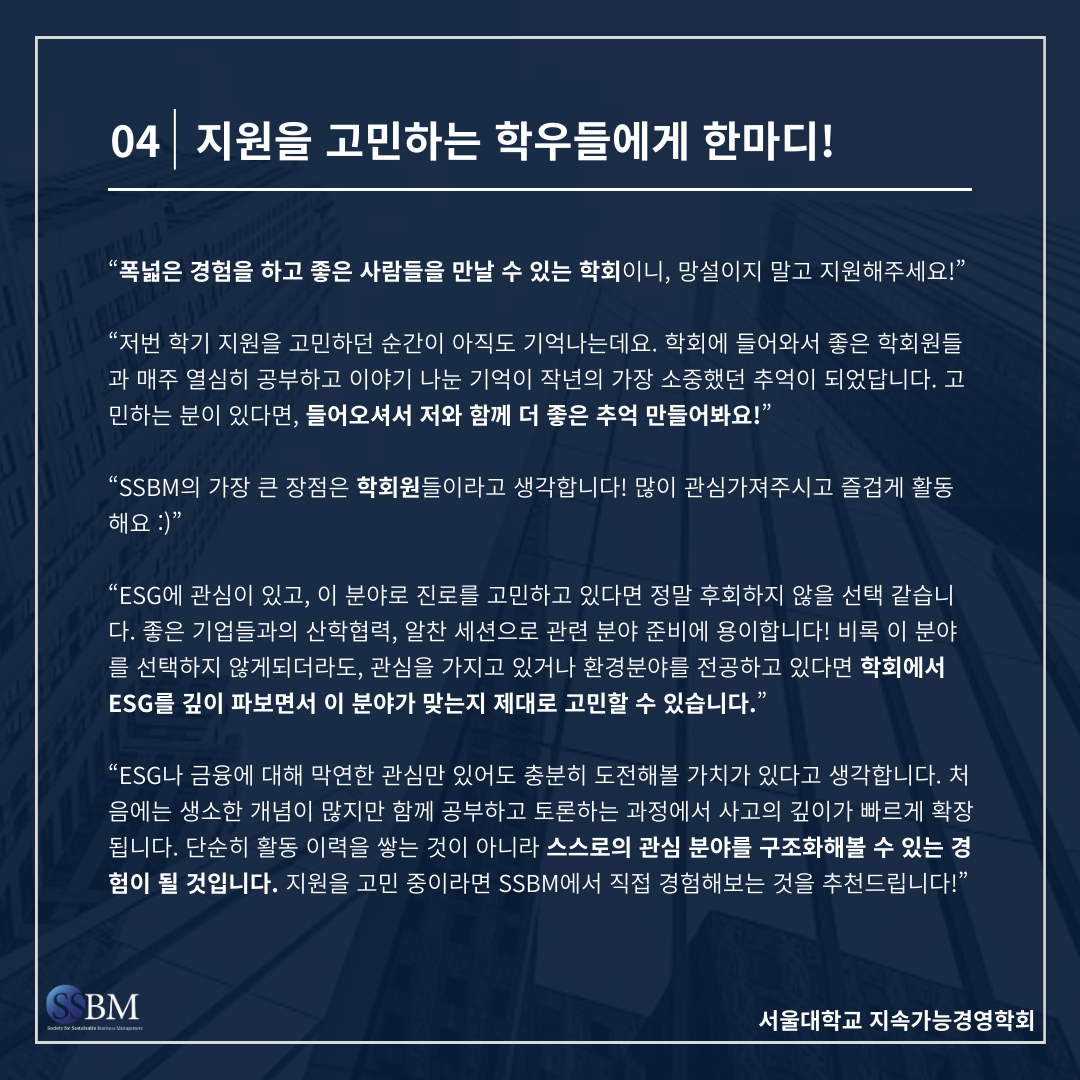 🔷 SSBM은 2006년 창립된 서울대학교 경영대학 소속 학술동아리로, 교내 유일의 ESG 및 CSR 전문 학회입니다. 특히 2023년 2학기부터는 CSR에서 ESG로 전환되고 있는 트렌드를 반영하여 ‘SNUCSR’에서 ‘SSBM’으로 학회명을 변경하여 활동하고 있습니다.